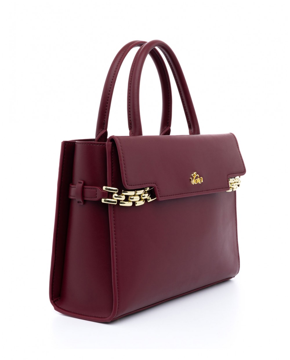 Τσάντα χειρός μπορντό με διακοσμητικά χρυσά μπρασελέ.