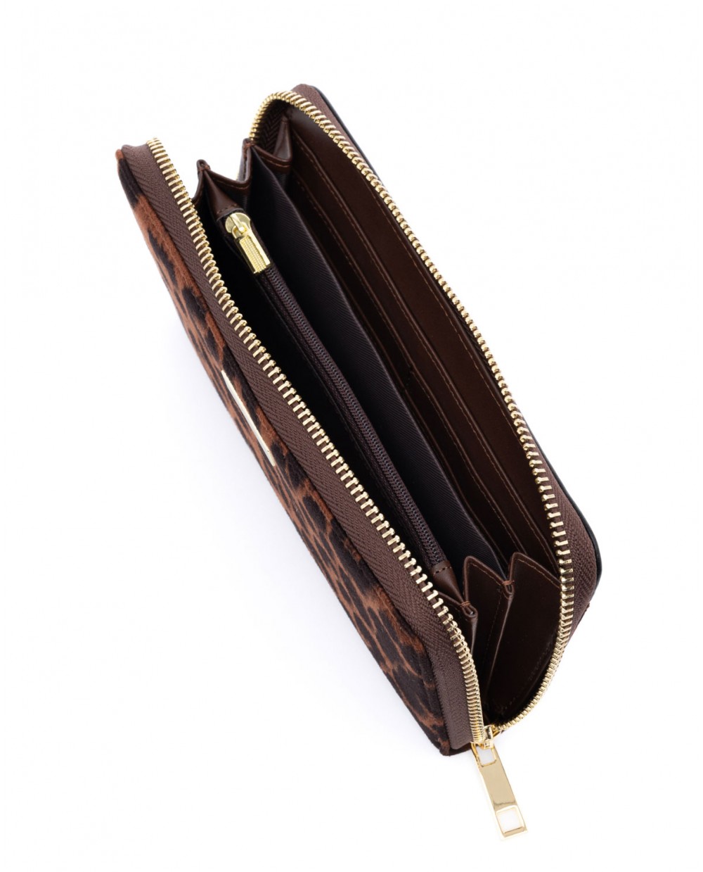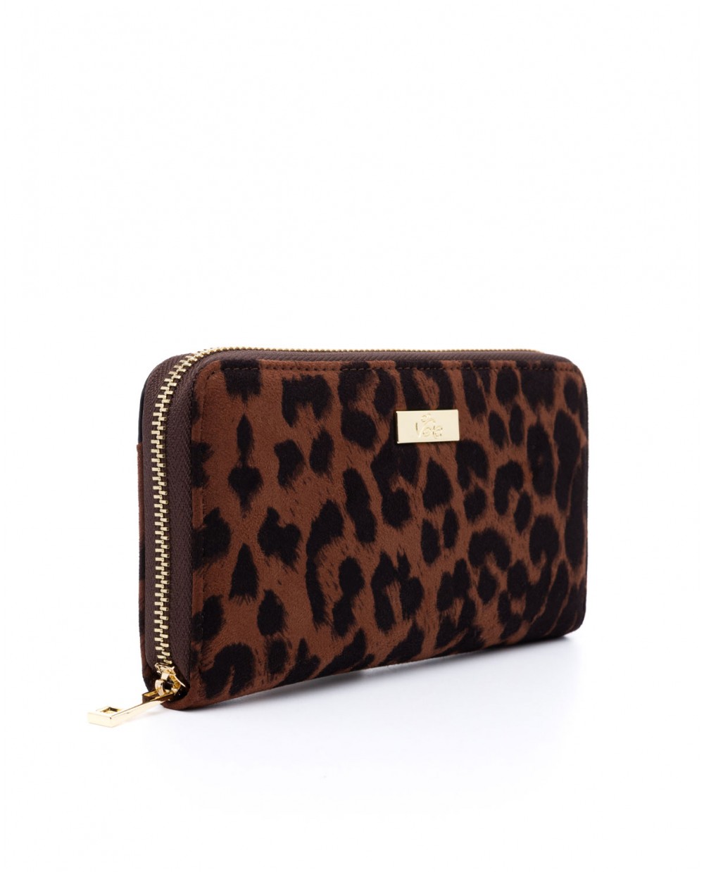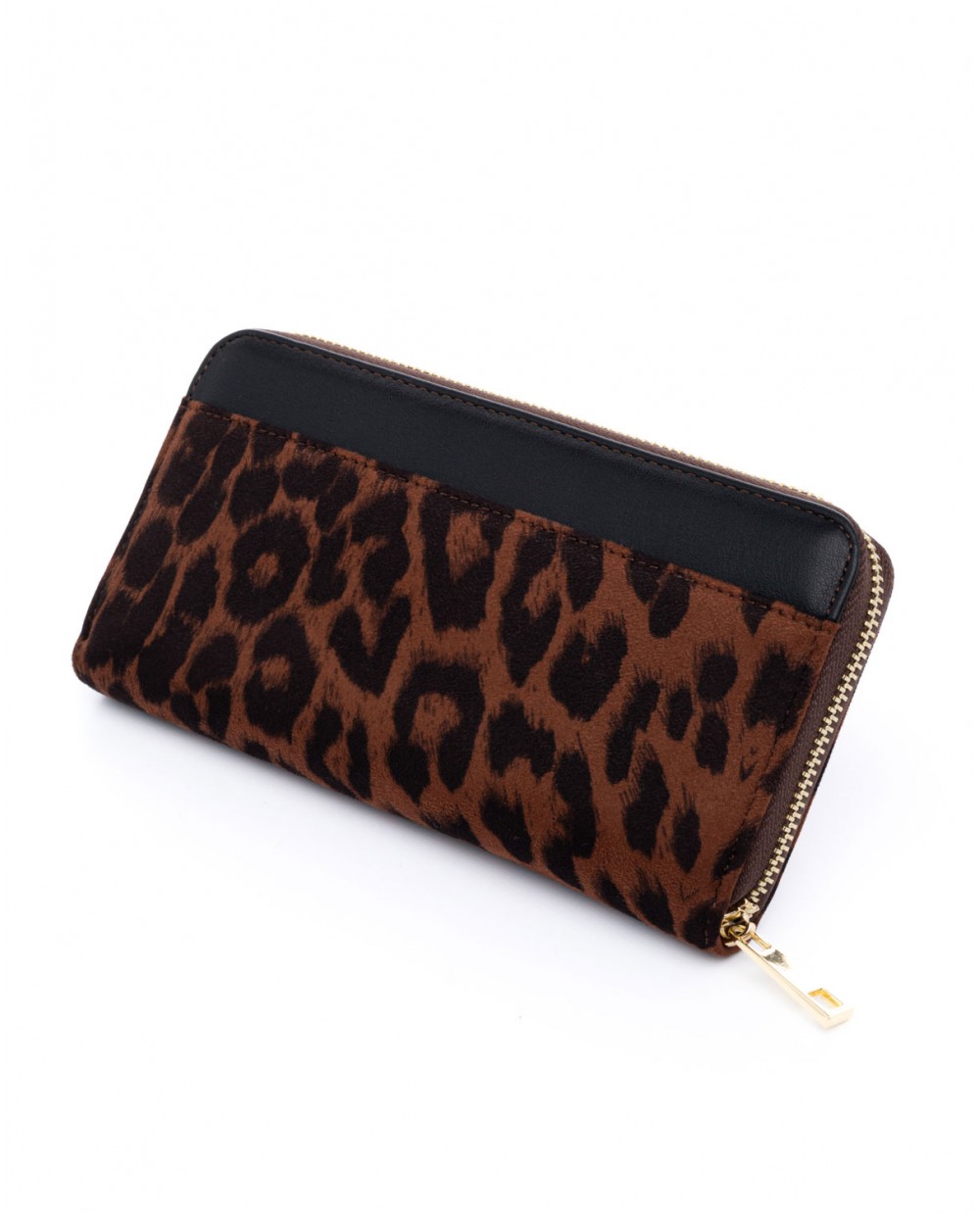 Πορτοφόλι σουέντ καφέ λεοπάρ με φερμουάρ και εξωτερική τσέπη στο πίσω μέρος.