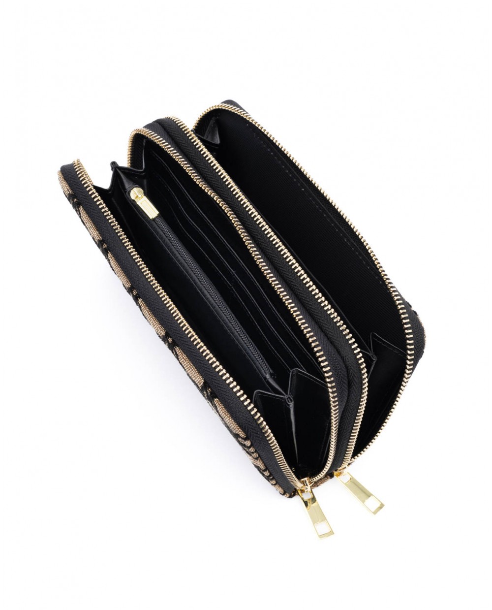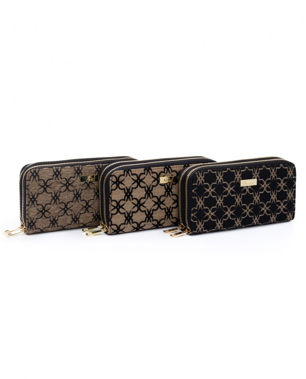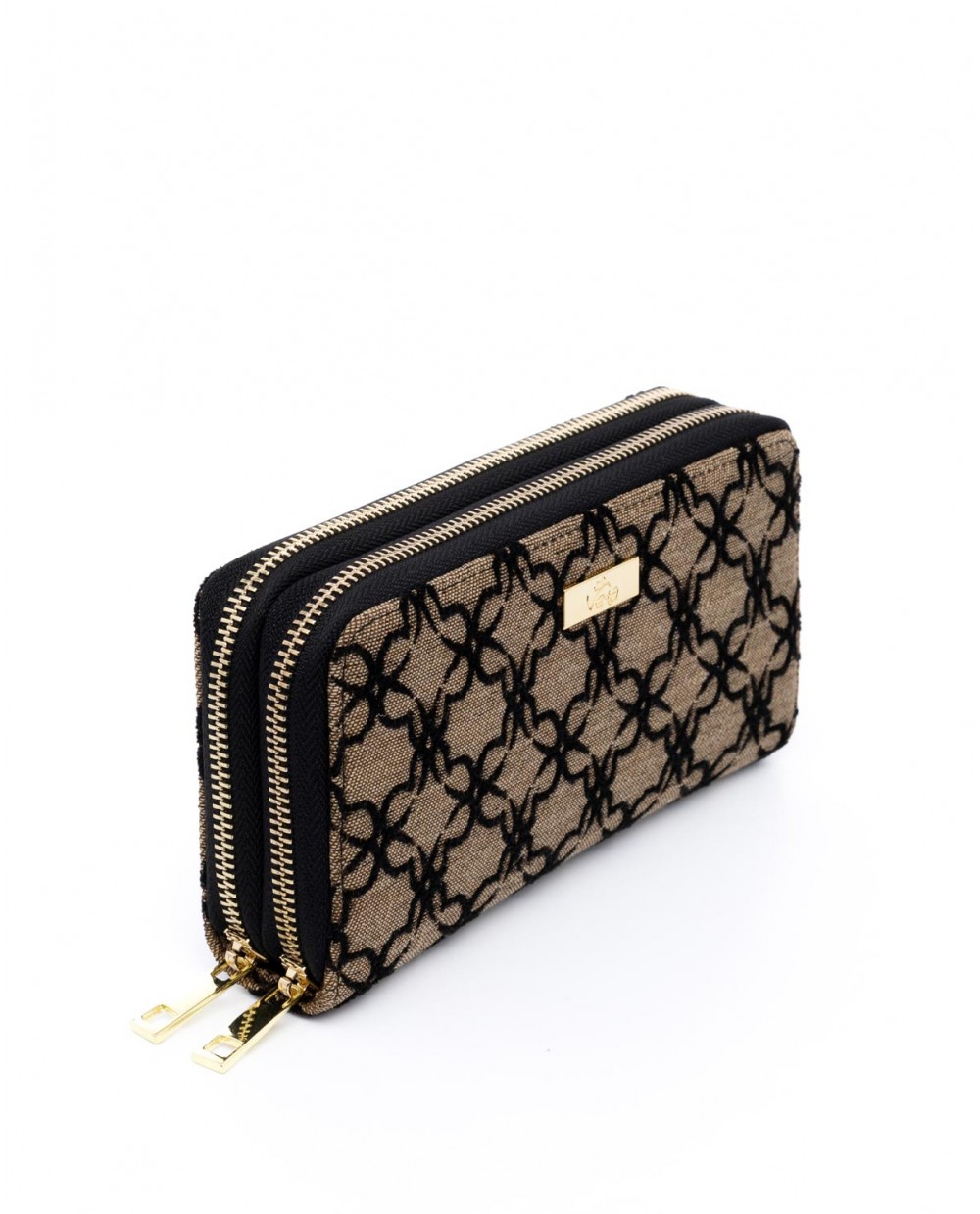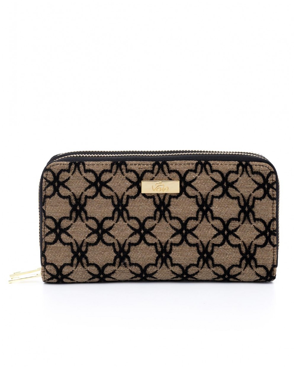 Πορτοφόλι υφασμάτινο μπεζ με μαύρο βελούδινο μοτίβο λογότυπου Veta και διπλό φερμουάρ.